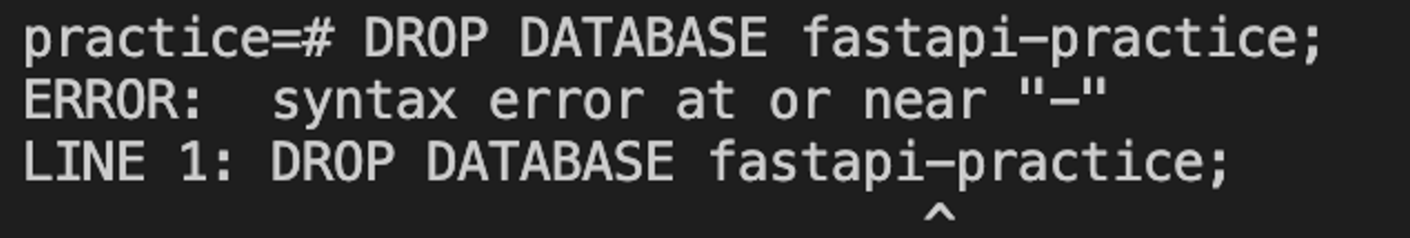 - 'practice'๋ผ๋ DB์์ 'fastapi-pracitce'๋ผ๋ DB๋ฅผ ์ญ์ ํ๊ณ ์ถ์ (DROP DATABASE)
