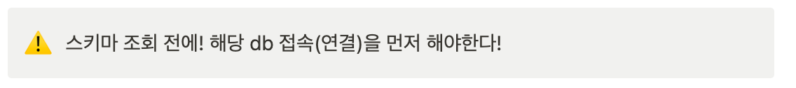 ์คํค๋ง ๋ํ ํ ์ด๋ธ๊ณผ ๋ง์ฐฌ๊ฐ์ง๋ก, ์กฐํํ๊ธฐ ์ ์ DB์ ์ฐ๊ฒฐ์ ๋จผ์ ํด์ผํ๋ค!