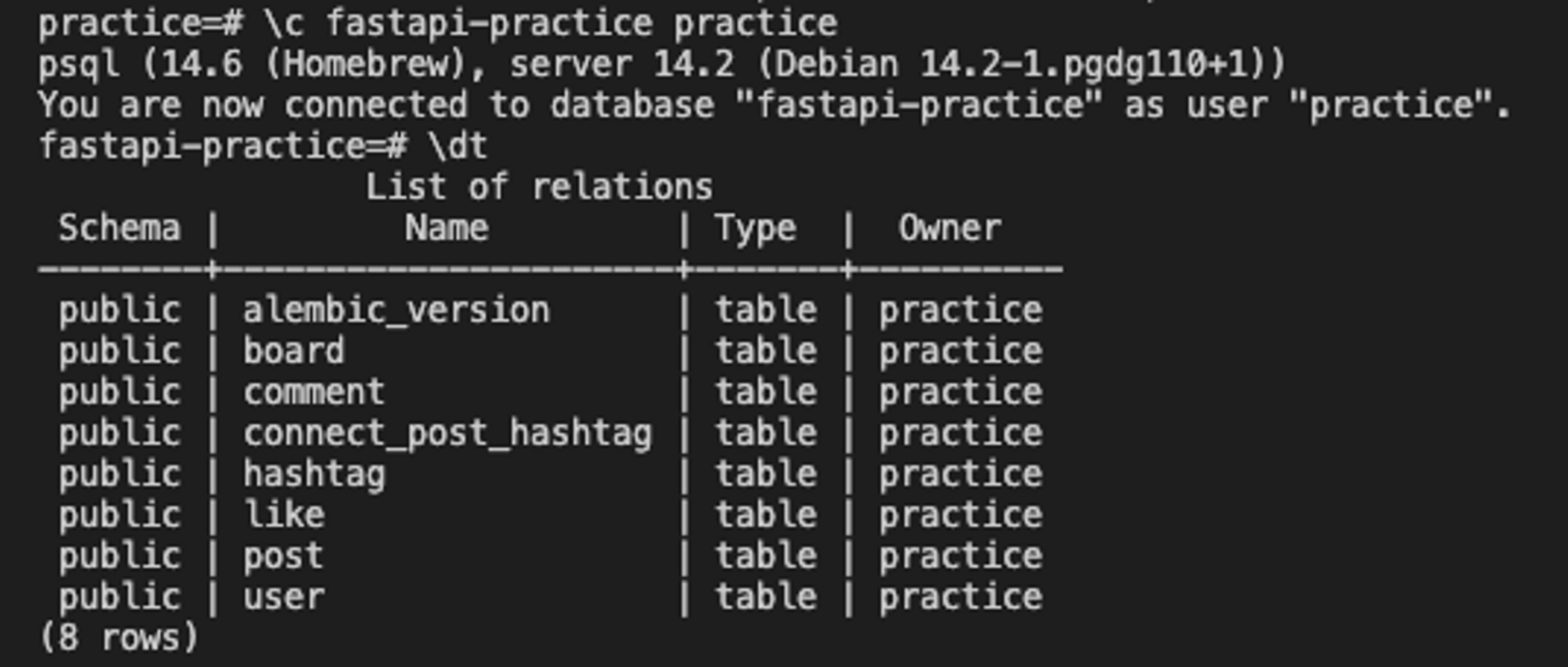 - =# \dt๋ก ์ ์ฒด ํ ์ด๋ธ์ ์กฐํํด์ ๋ด๊ฐ ๋ง๋ 'ํ ์ด๋ธ ์ด๋ฆ'์ด ์๋์ง ํ์ธํ๋ค.
