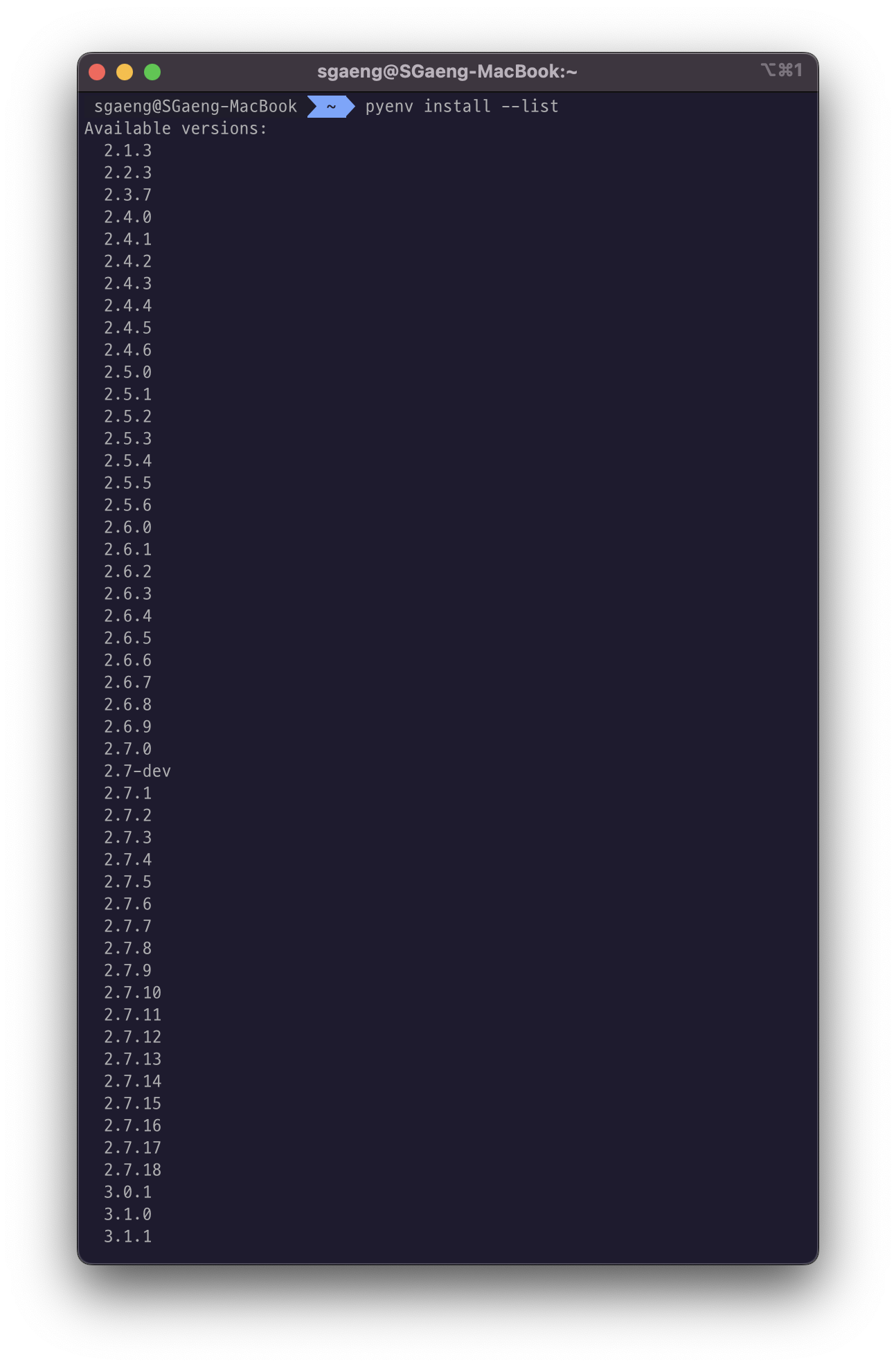 1-1. (์๋ ๋ช ๋ น์ด): pyenv๋ฅผ ํตํด ์ค์น ๊ฐ๋ฅํ python-version ๋ชฉ๋ก ํ์ธ