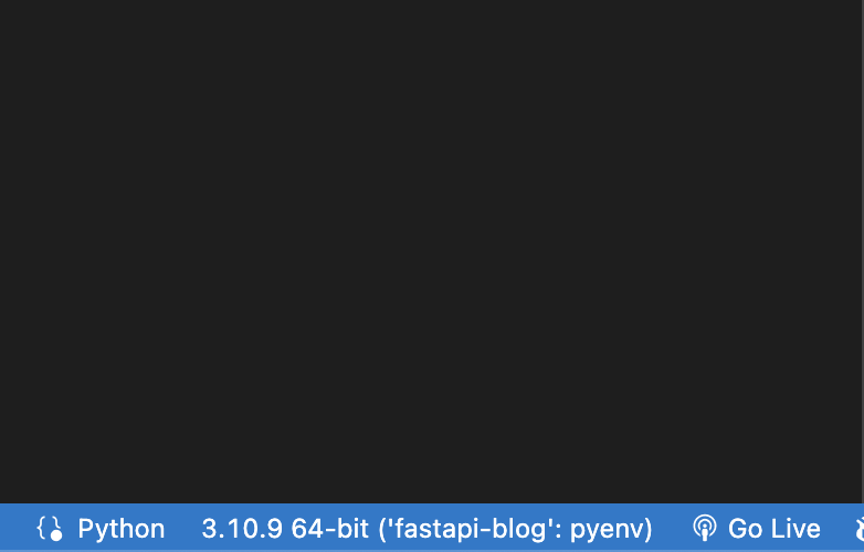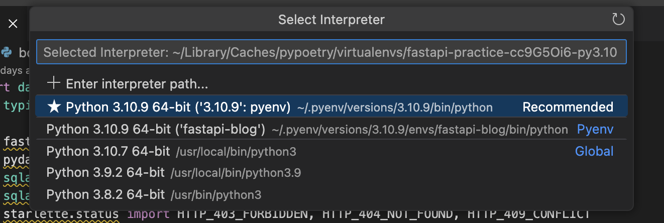 ํ์ง๋ง ์ฐ๋ฆฌ๊ฐ fastapi, pydantic ๋ฑ ์ฌ๋ฌ ํจํค์ง๋ฅผ ์ค์นํ ๊ฐ์ํ๊ฒฝ(local python)์ path๋ ๊ทธ ์๋์ ์๋ '~/.pyenv/versions/3.10.9/envs/fastapi-blog/bin/python' ์ด๋ค.