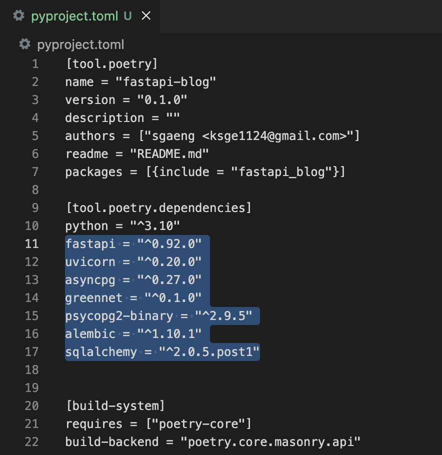 ์ด ๊ฒฝ์ฐ, ์ถ๊ฐํ ํจํค์ง&๋ฒ์ ์ pyproject.toml ํ์ผ ์์ [tool.peotry.dependencies] ์๋์ ์ ํ๋ค.