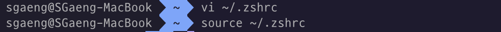 0-2. vi/vim ์๋ํฐ๋ฅผ ์ฌ์ฉํด์ ~/.zshrc ์์ ๋งจ ๋ง์ง๋ง์ ์๋ ๋ด์ฉ์ ์ถ๊ฐํ๋ค. ($ vi ~/.zshrc)